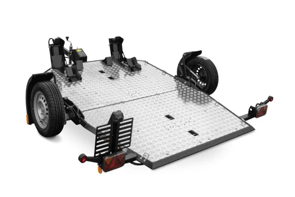 Der Lorries MT-2 Motorradanhänger transportiert sicher bis zu zwei Motorräder. Die Konstruktion aus feuerverzinktem Stahl schützt vor Korrosion und garantiert maximale Stabilität. Die rutschfeste Stahlbodenplatte und verstellbare Schienen mit Vorderradhaltern sorgen für sicheren Halt der Motorräder. Der kompakte, klappbare Anhänger lässt sich leicht vertikal oder horizontal lagern. Mit verstärkter Deichsel, robusten Rädern und integriertem LED-Lichtsystem bietet er Stabilität, Komfort und Sicherheit auf allen Fahrten. Eine zuverlässige Lösung für anspruchsvolle Motorradfahrer.